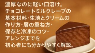クレープの知識あれこれ チョコレートミルクレープ基本レシピ|薄焼き生地と口溶け断面の作り方とチョコクリームの重ね方ガイド 濃厚なのに軽い口溶け。チョコレートミルクレープの基本材料・生地とクリームの作り方・層の重ね方・保存と冷凍のコツ・アレンジまでを初心者にも分かりやすく解説。 2025.09.04 クレープの知識あれこれ
