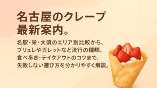 クレープの知識あれこれ 名古屋でクレープ名店探し!名駅・栄・大須の人気店徹底比較と選び方ガイド 名古屋のクレープ最新案内。名駅・栄・大須のエリア別比較から、ブリュレやガレットなど流行の種類、食べ歩き・テイクアウトのコツまで。失敗しない選び方を分かりやすく解説。 2025.09.03 クレープの知識あれこれ